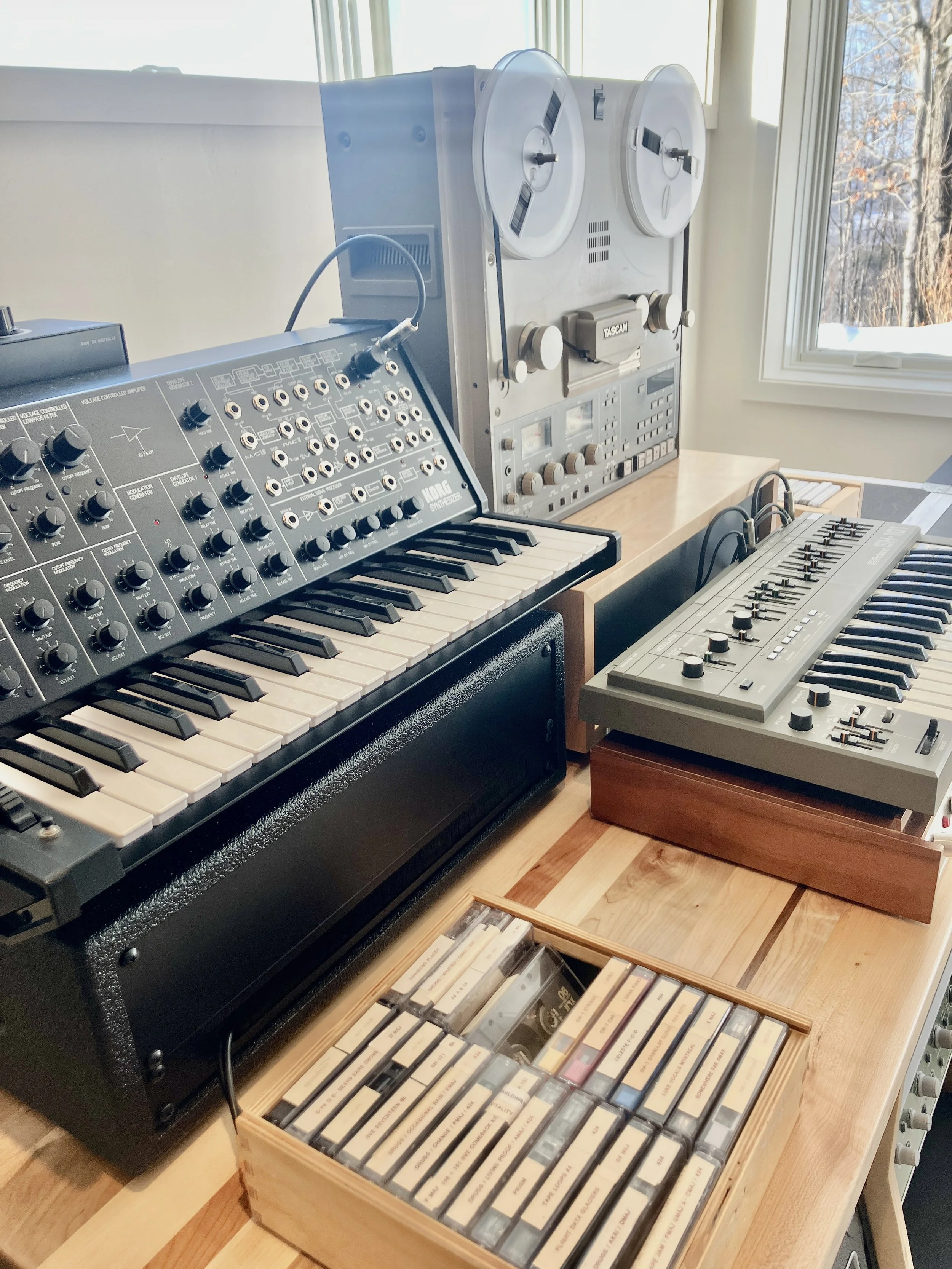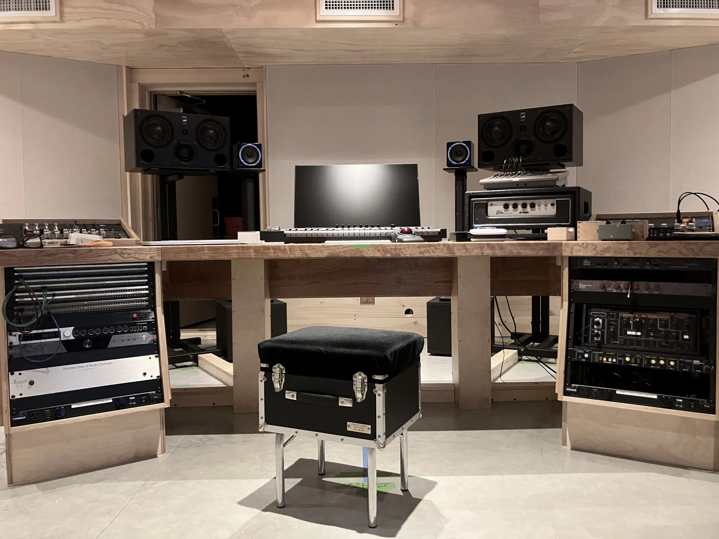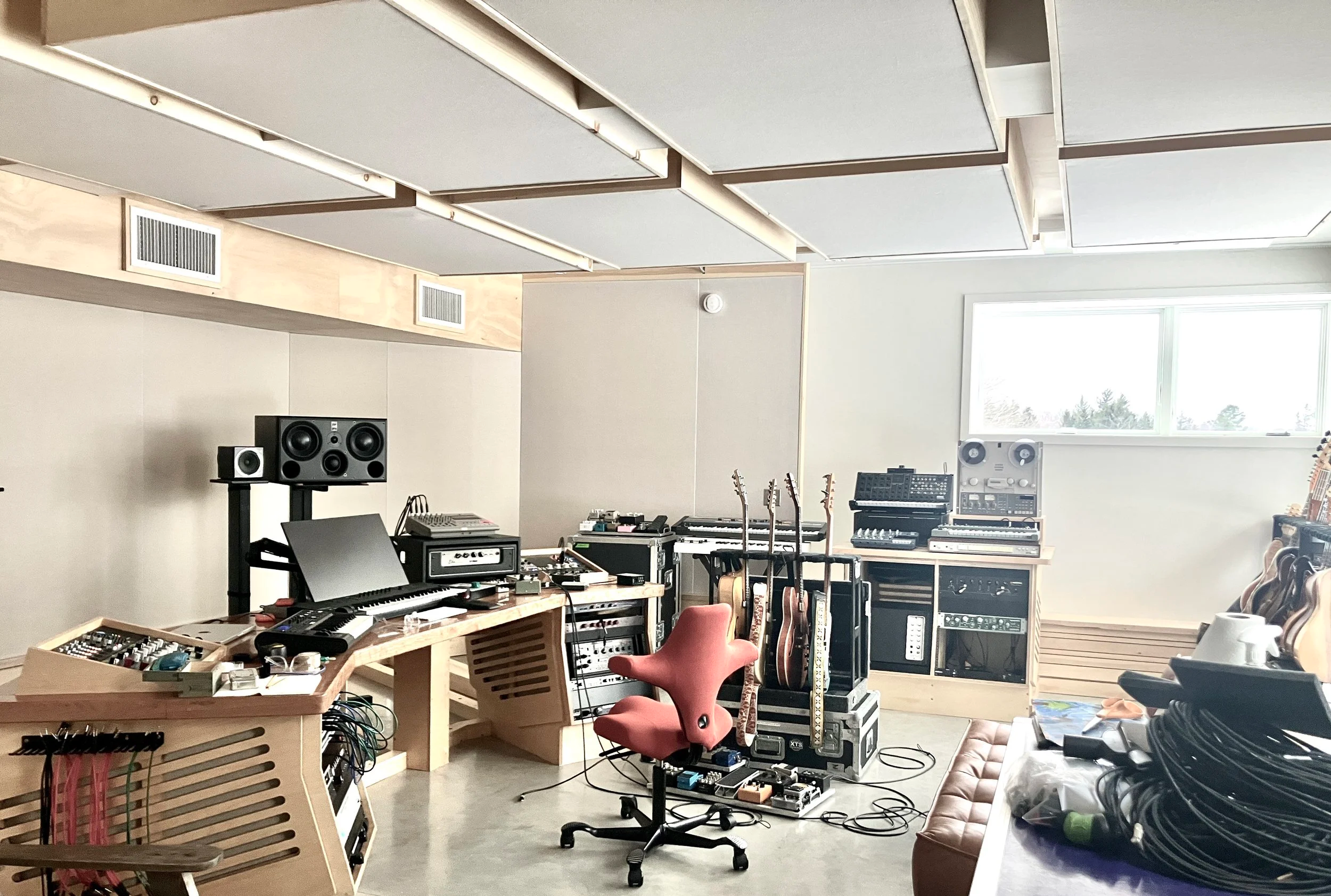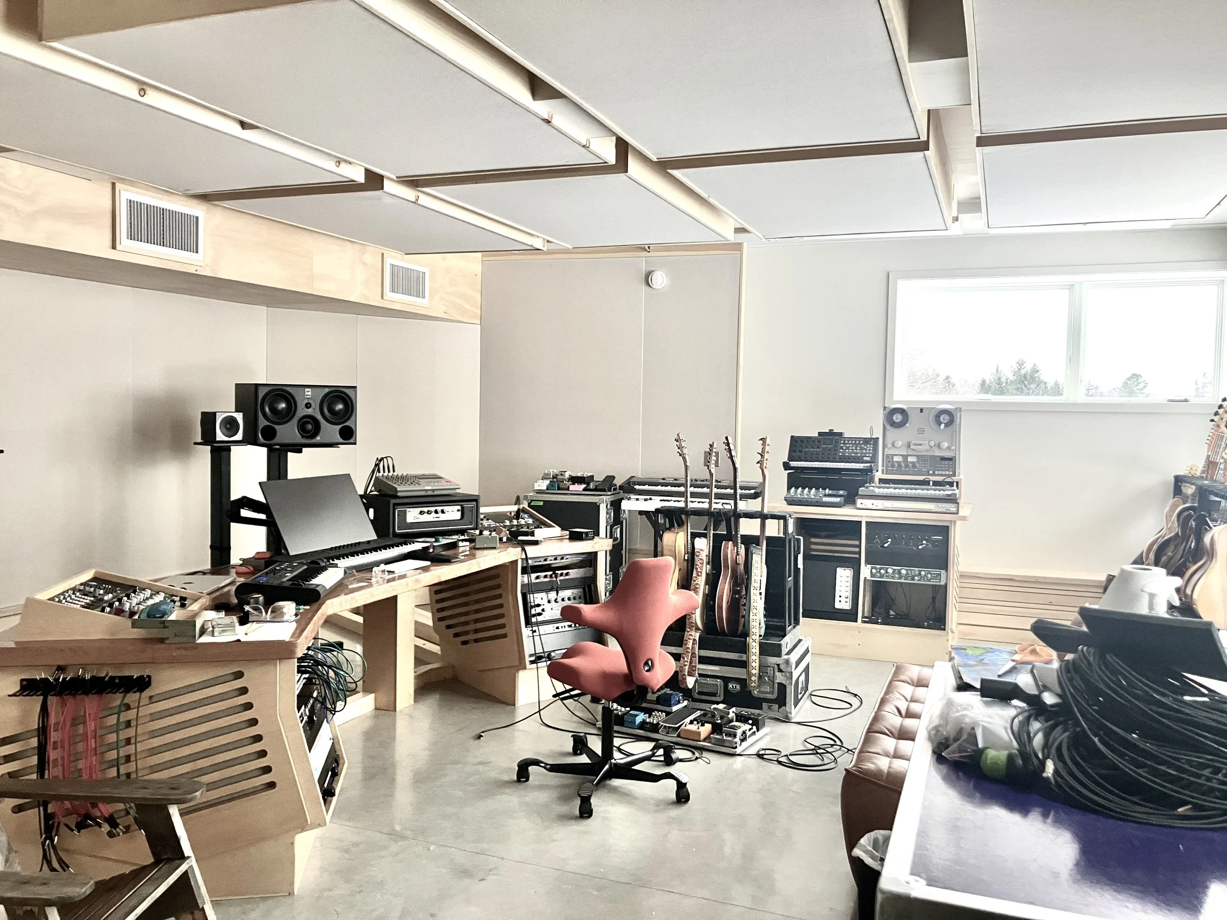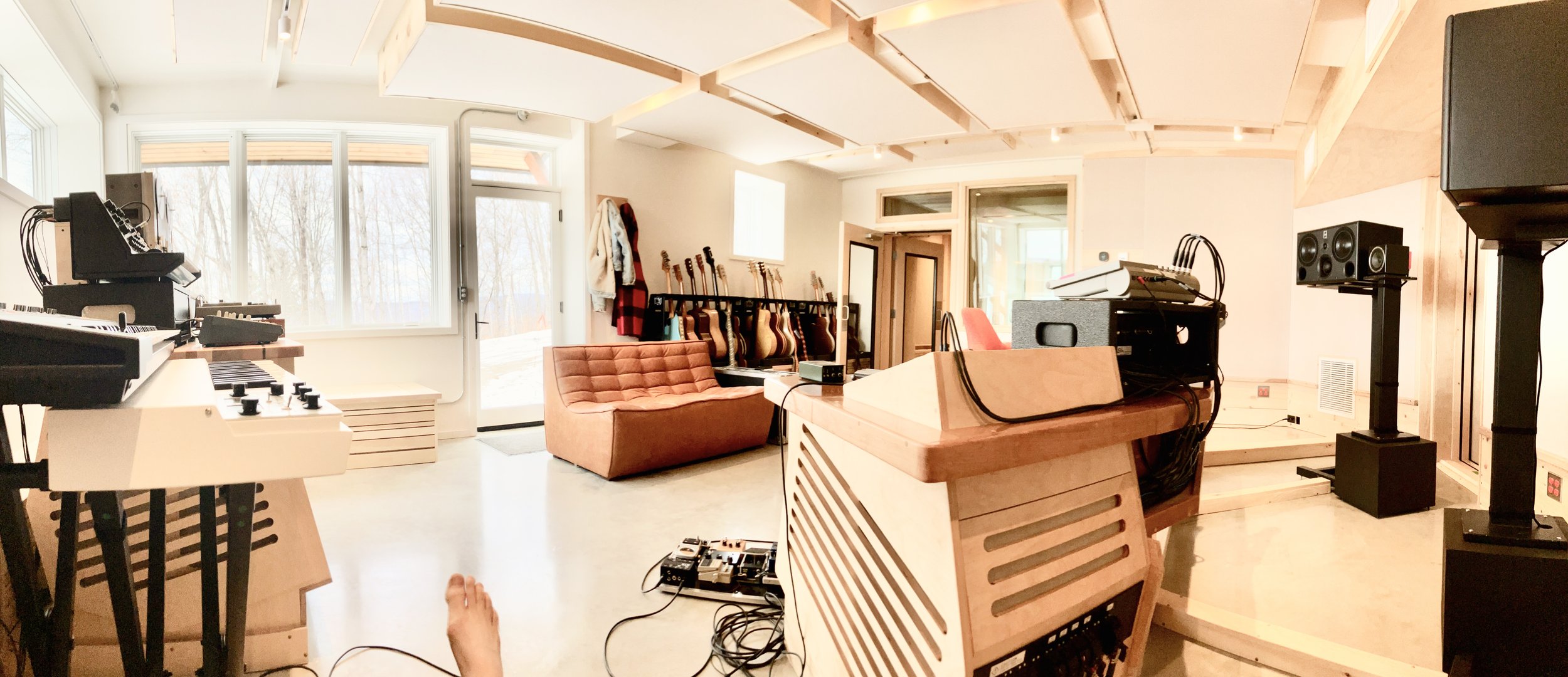 Zeno Mountain is a world class writing, recording, and mixing space in Vermont, designed by legendary architect and acoustician Martin Pilchner. The studio borrows from the best rooms I’ve worked in over the last 20 years as an artist, session musician, and producer, and is home base for my collaborations. Perched atop an open hillside on 21 acres with views of the Adirondack mountain range, large windows bathe the 25’ x 22’ control room in natural light. The live room is comfortably big and houses an extensive collection of synths, unique stringed instruments, vintage drums, and amps.